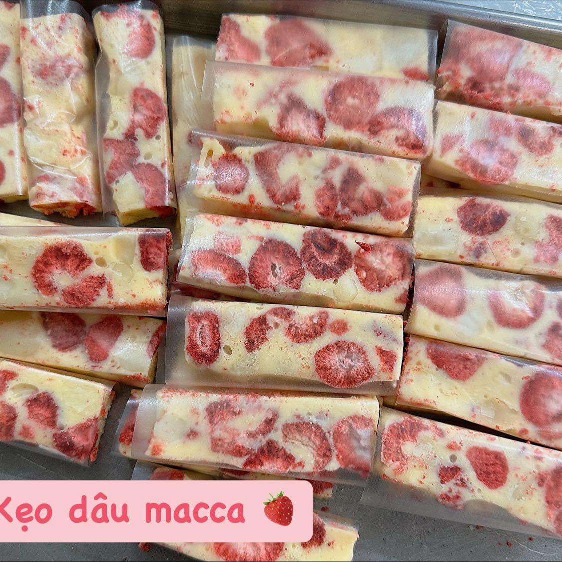 gọi là kẹo nhưng cực ít ngọt, béo béo của nền kẹo sữa, cắn đến đâu ngập dâu sấy hay đào dẻo & cam dẻo.. mix cùng macca, viên dừa sấy sần sật thơm nức
