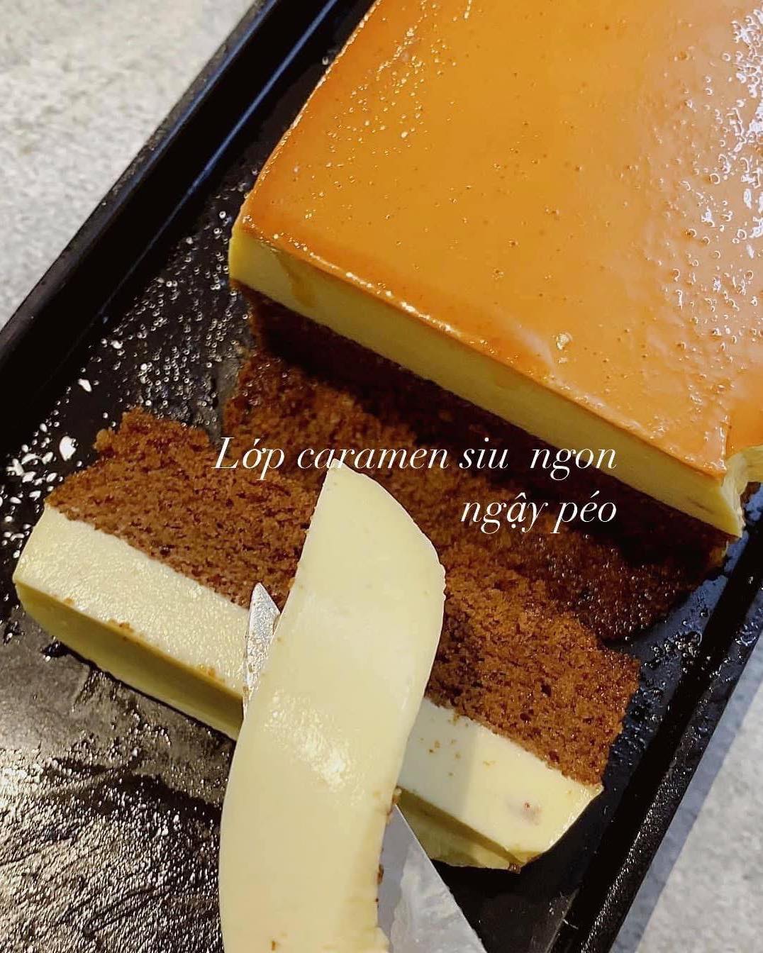 Caramel béo mịn mềm tan từ trứng tươi và whipping ăn cùng phần cốt bánh socola x2 vị ngon trong cùng chiếc bánh