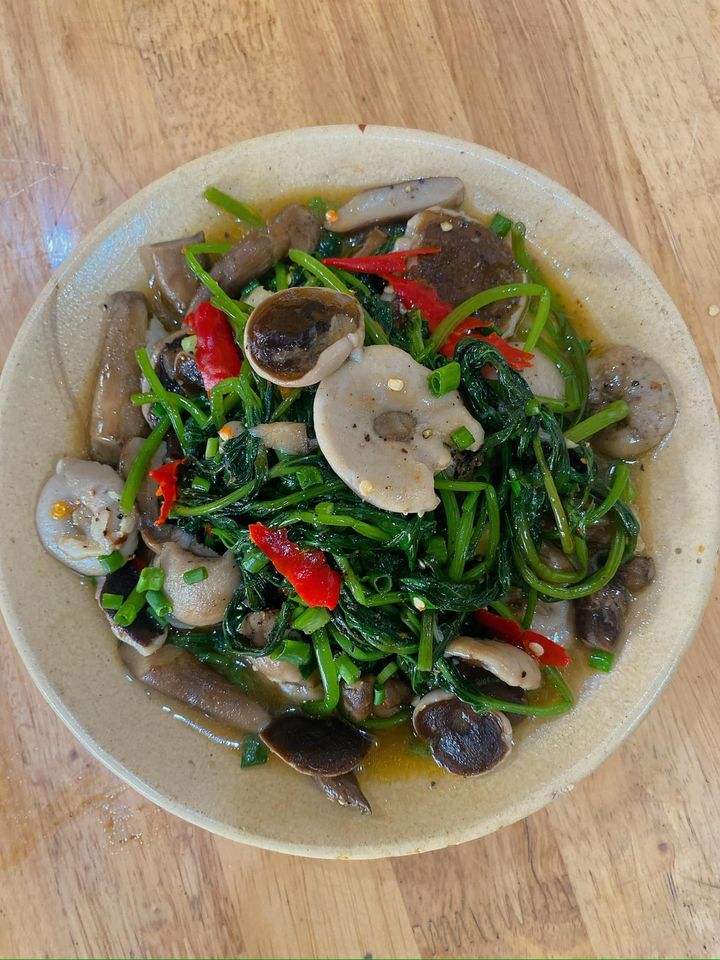 – Rau khoai xào nấm tràm, món ni chắc là huyền thoại luôn rồi.