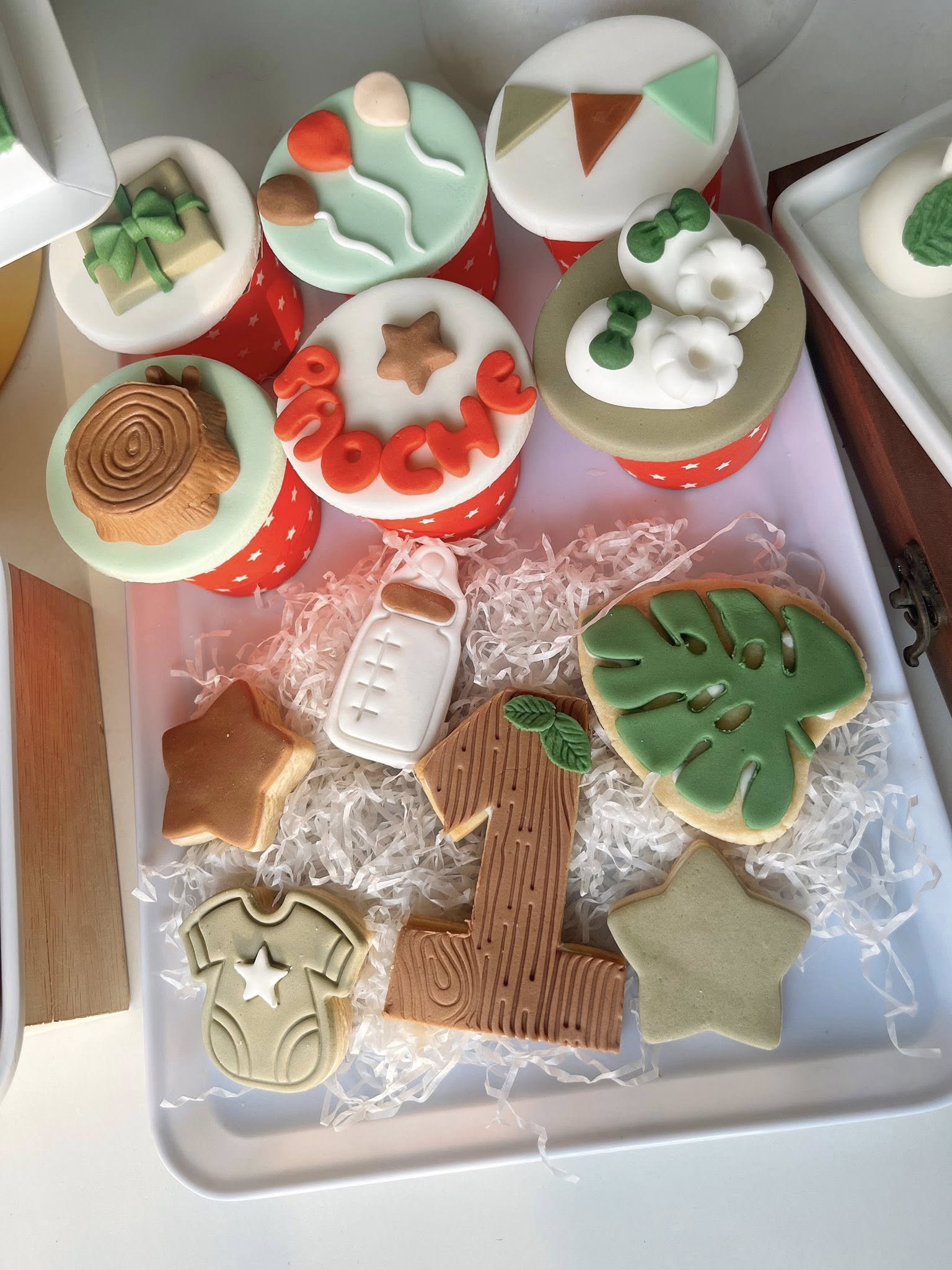 Bánh hai tầng (size 20+14cm) + bánh một tầng (size 20cm) + set mini 24 bánh phù hợp chủ đề và màu sắc tiệc