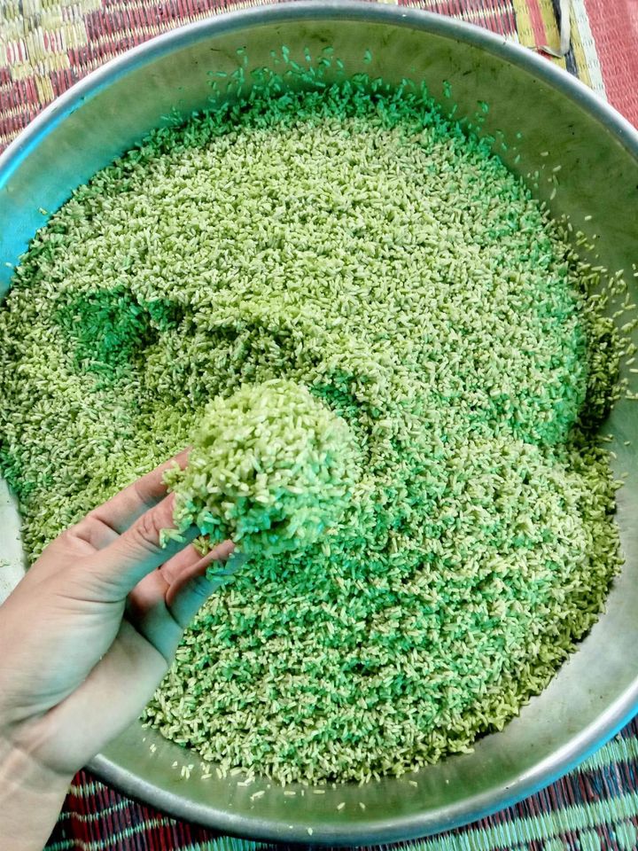 Tiếp đến là phần đậu xanh, phải ngâm mềm, đồ chín, rồi đem đi sên, trộn thêm gia vị, sau đó vắt thành từng nắm nhỏ vừa bằng nắm đấm.