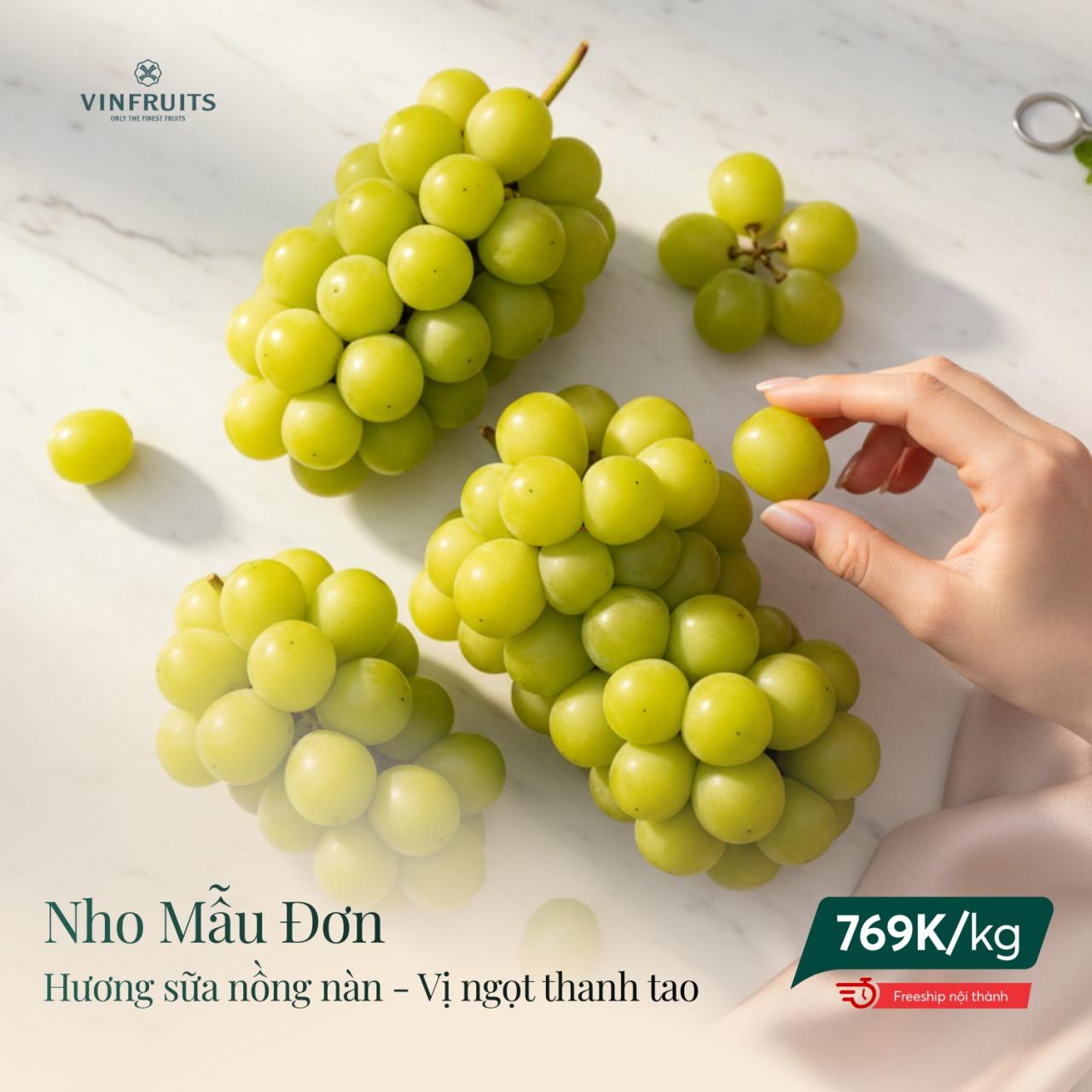 Từng chùm nho xanh ngọc bích, căng bóng, tỏa hương sữa dịu nhẹ nồng nàn. Vị ngọt thanh tao, giòn tan trong khoang miệng tựa như gió xuân mát lành, tượng trưng cho sự Viên Mãn – Hanh Thông.