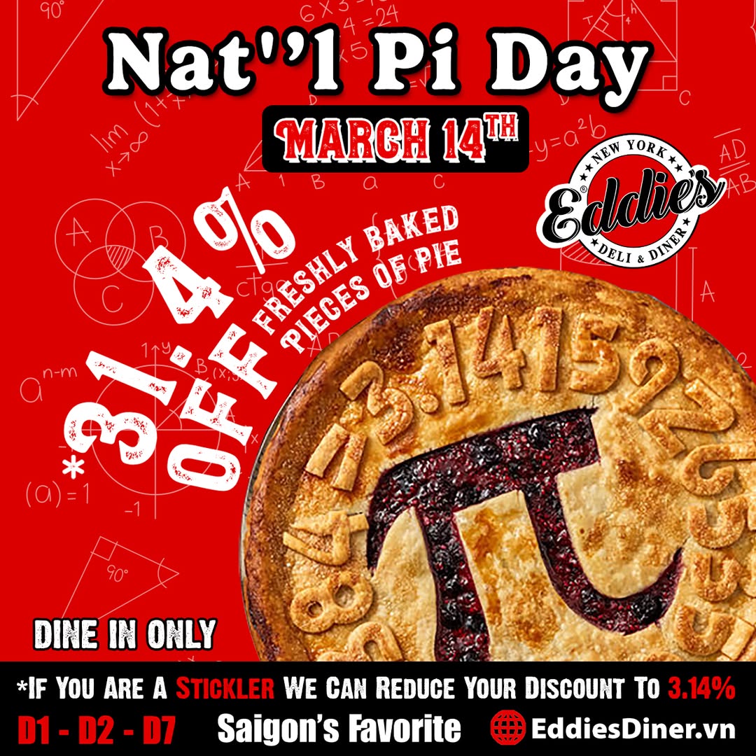 [🆕🇻🇳] Eddies D1 Diner – Eddie’s District 1 serves Authentically American Cuisine in our Original 1950’s Style Diner 🍔 Top1Food 🍜 Life of Pi(e): Celebrate March 14th with Eddie’s! Come celebrate the magic of Pi with us on March 14th! Enjoy 31.4% OFF on any www.eddiesdiner.vn fresh , shares-0✔️ , likes-113❤️️ , date-2025-03-14 14:25:15🇻🇳🇻🇳🇻🇳📰🆕